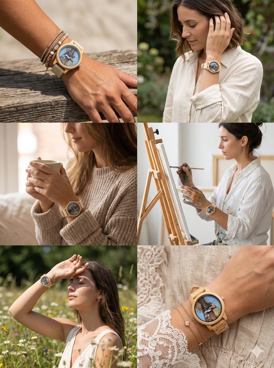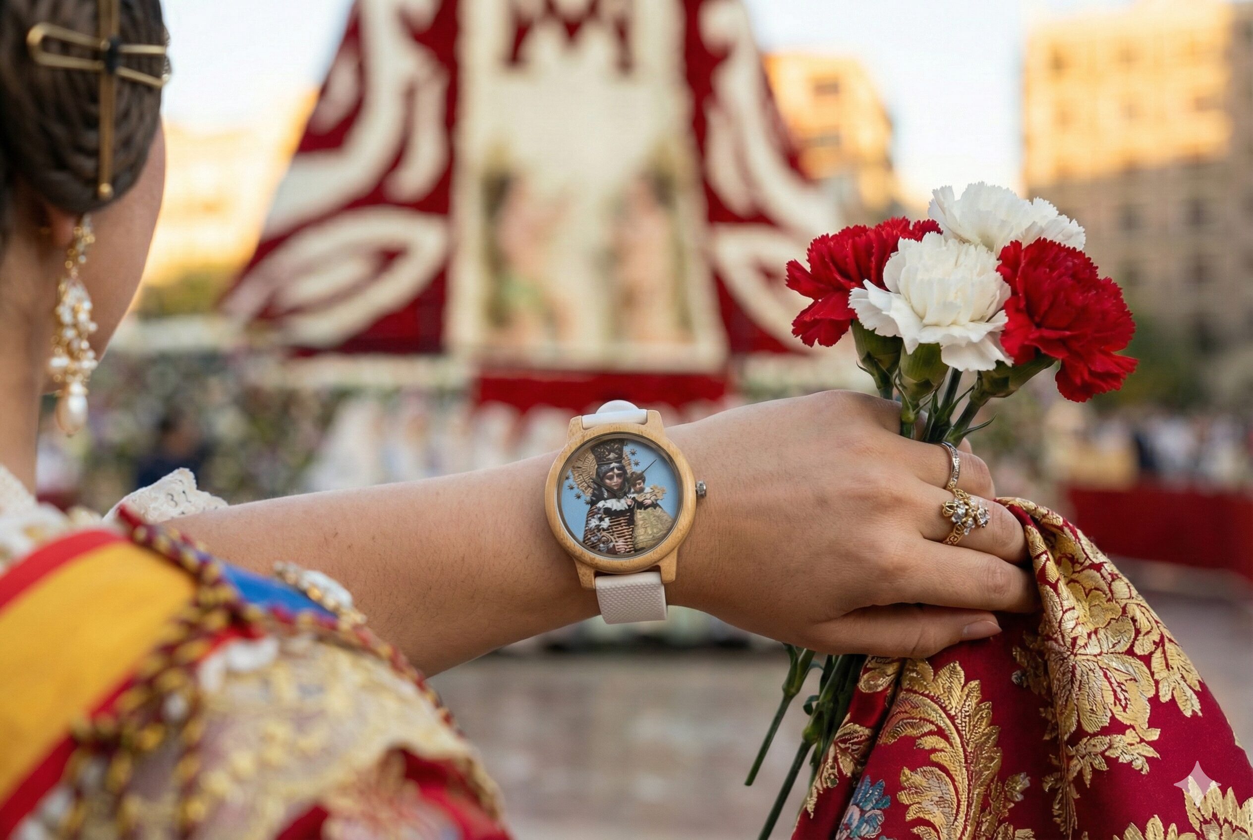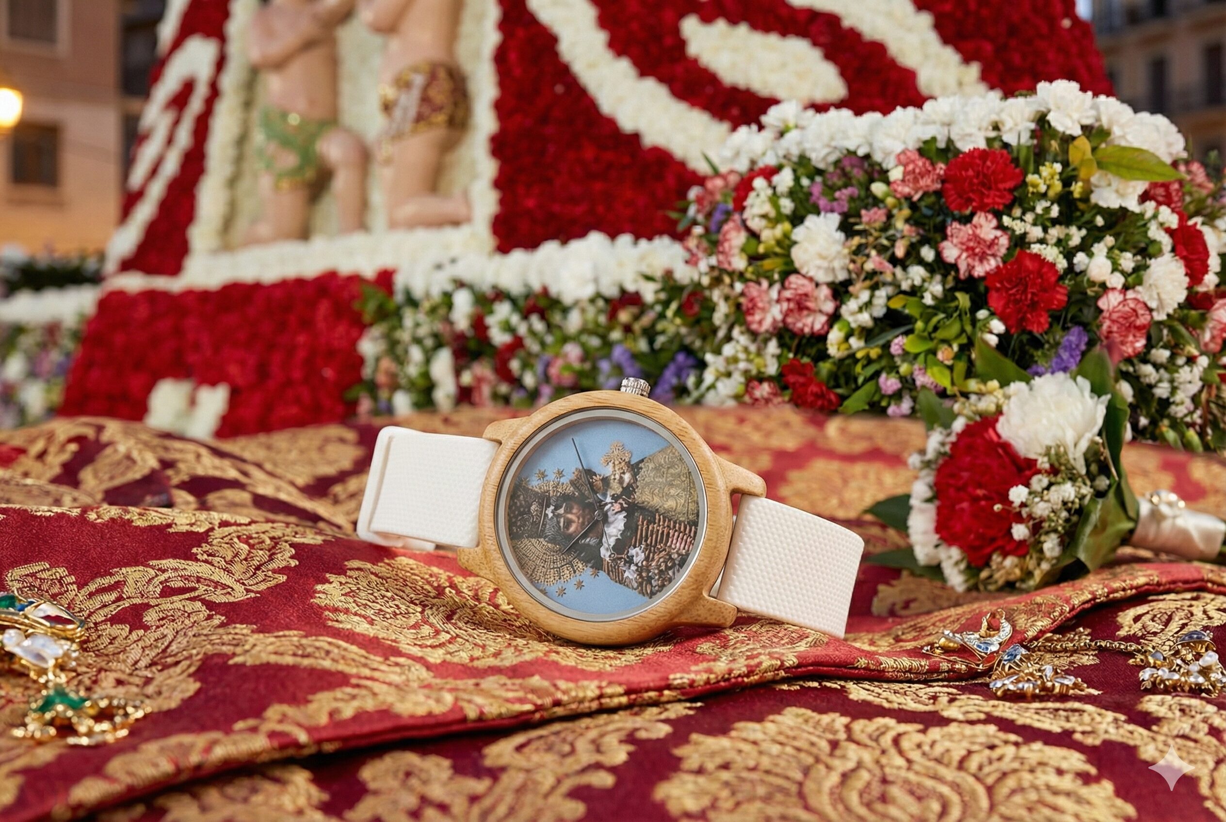 Su caja de bambú de 44 mm, ligera y elegante, resalta una imagen devocional de la Virgen y el Niño protegida por cristal Hardlex, resistente al uso cotidiano. La correa de silicona blanca, suave y flexible, brinda comodidad durante todo el día y se ajusta fácilmente mediante su cierre de hebilla.