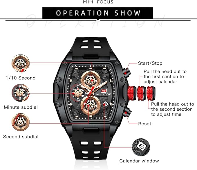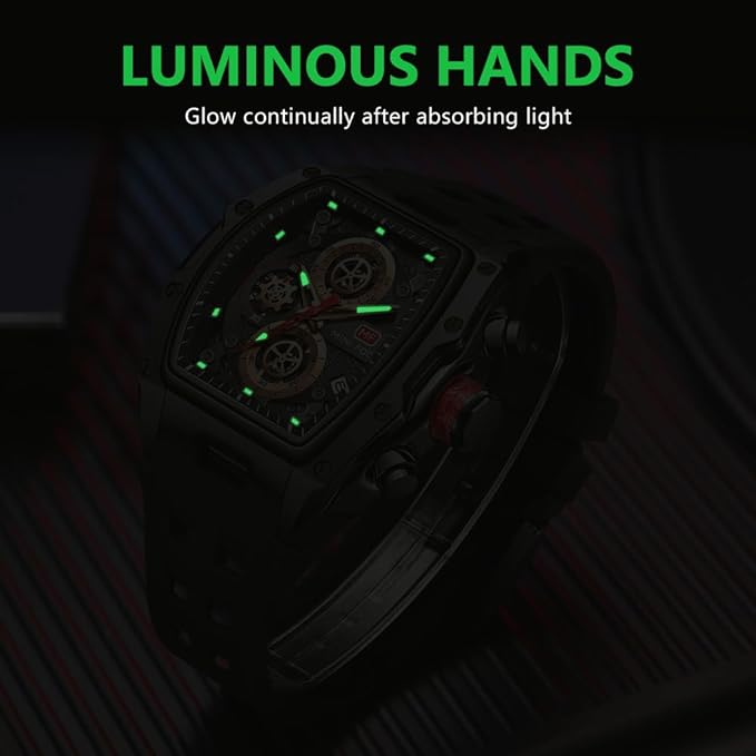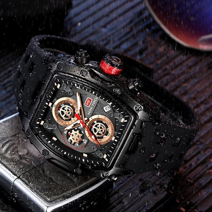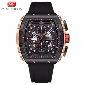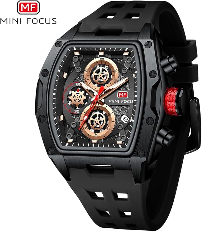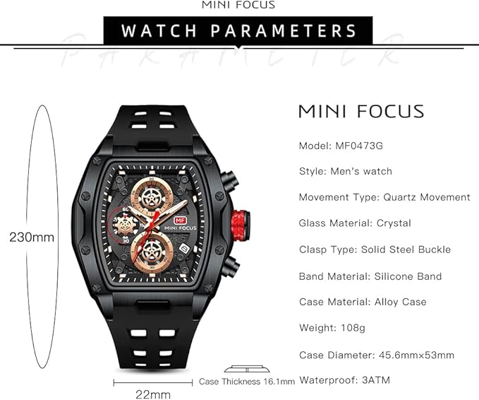El reloj MINI FOCUS MF0473G para hombre combina un diseño lujoso, deportivo y moderno con la precisión de un movimiento de cuarzo japonés. Su caja tonneau de 46 mm en aleación metálica y su correa de silicona de 22 mm ofrecen comodidad y resistencia para el uso diario.